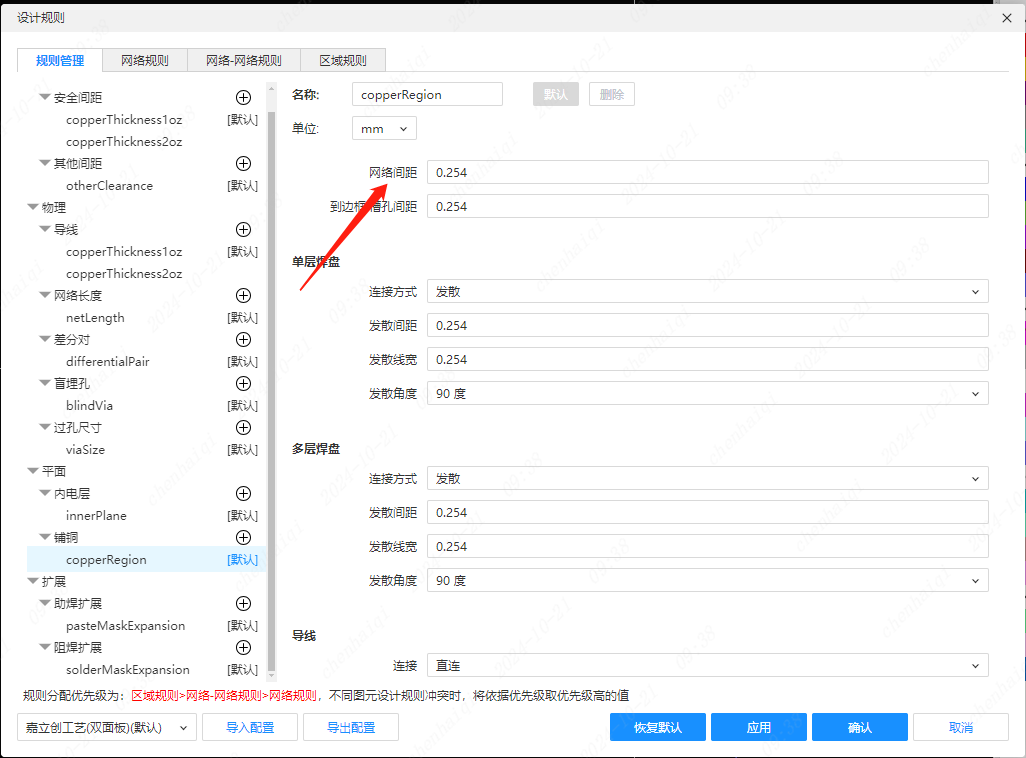 1、目前规则设置是铺铜的网络间距是10mil,修改为5mil,依然无法连接,请问什么原因?