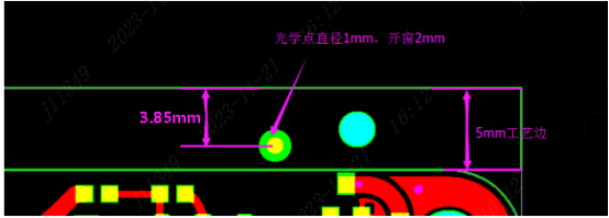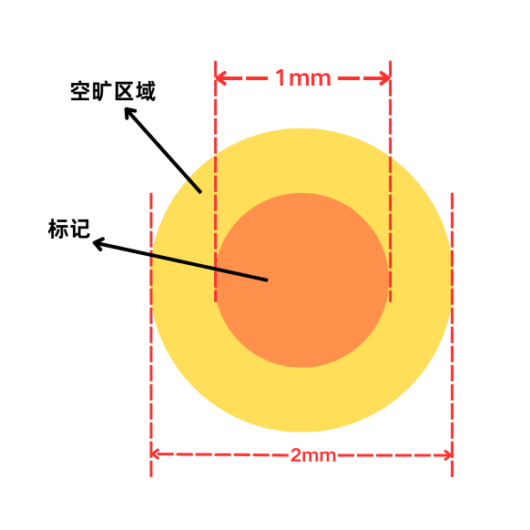 在线路层设置3-4个直径为1mm的实心圆盘,阻焊层设置直径大小为2mm的开窗,且开窗内部不能有线路或其它元素排布(可能会影响mark点识别)如图所示: