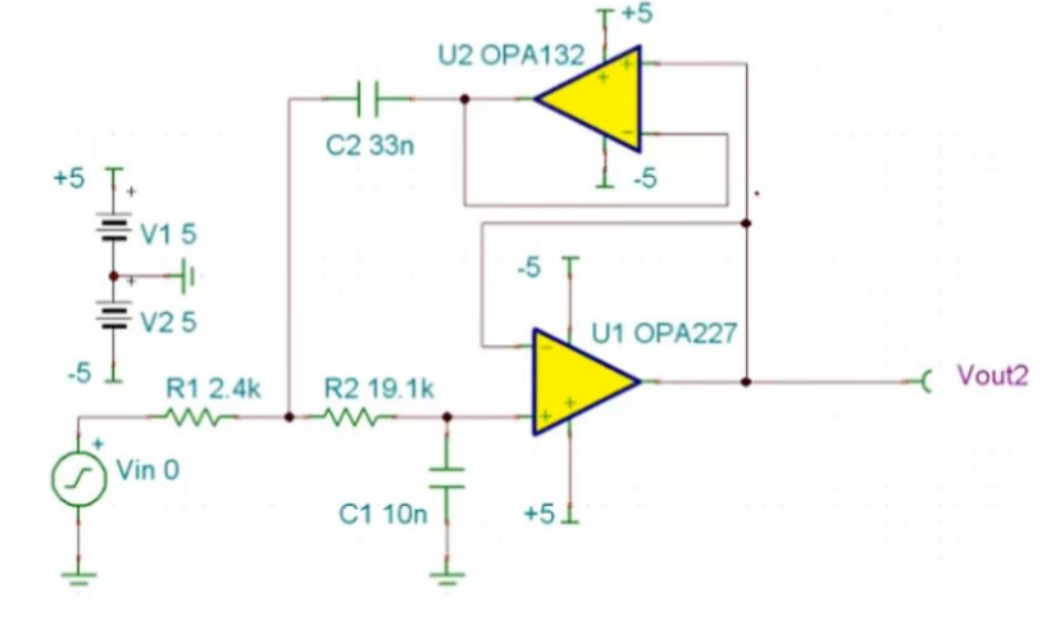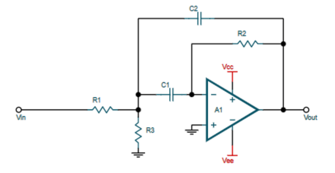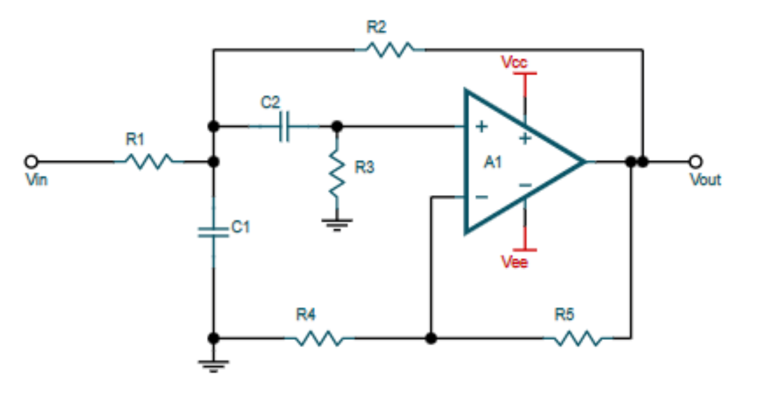 1.更换滤波器类型,例如本带通滤波器为MFB型带通滤波器,可更换为Sallen-key型滤波器,如下图所示,可以切断高频穿行路径(负反馈上的电容)。