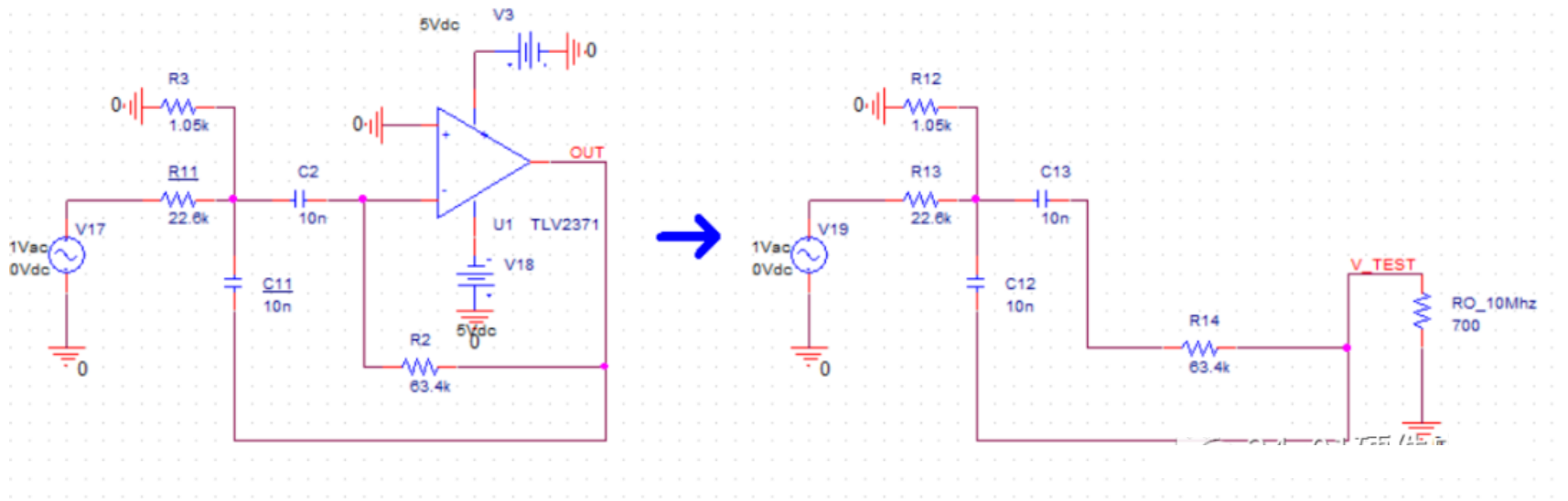 由于查TLV2371的数据手册没有查到其输出阻抗(输出阻抗随频率变化),于是通过仿真测得其 在10Mhz下 输出阻抗大约为700Ω,所以其在10Mhz下的等效电路变为了如下图所示: