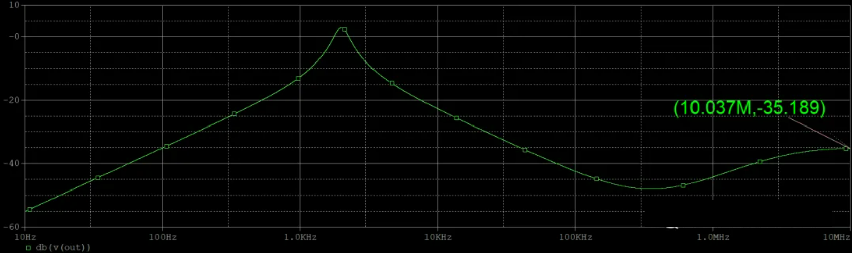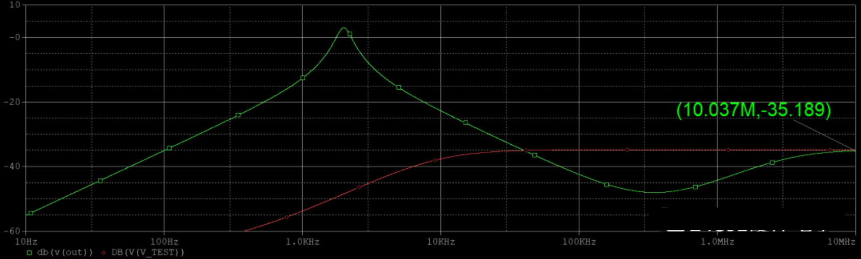 如下图参数&原理图所示,这是一个一阶的MFB型带通滤波器,在截止频率后,照理来说频率会以-20db/dec衰减,但是实际上发现,频率在到达300khz左右后便衰减不下去了,甚至幅频特性曲线在高频处发生了“上翘”;从而在高频处的滤波效果变差。那么究竟是怎么一回事呢?