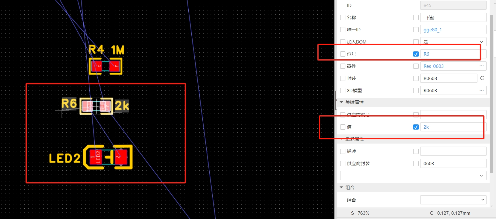 立创EDA专业版,PCB编辑元件时,PCB板元件有时候需要显示位号和值,如图显示,R6和2K都需要显示;有时候需要只显示值,如图,只显示LED2,不需要显示位号,当批量修改的时候怎么修改,总不会一个一个修改吧?