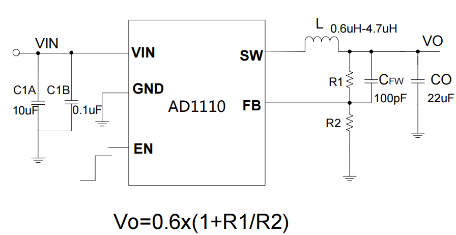 AD1110是一款同步降压转换器,输入电压范围为2.7V 至 5.5V。该器件针对小解决方案尺寸和高效率