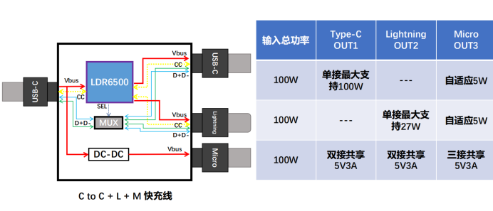 定义:LDR6500 一拖三快充线是一种具有 Type-C 接口的充电线,它的最大特点是可以同时连接三个设备进行快速充电。