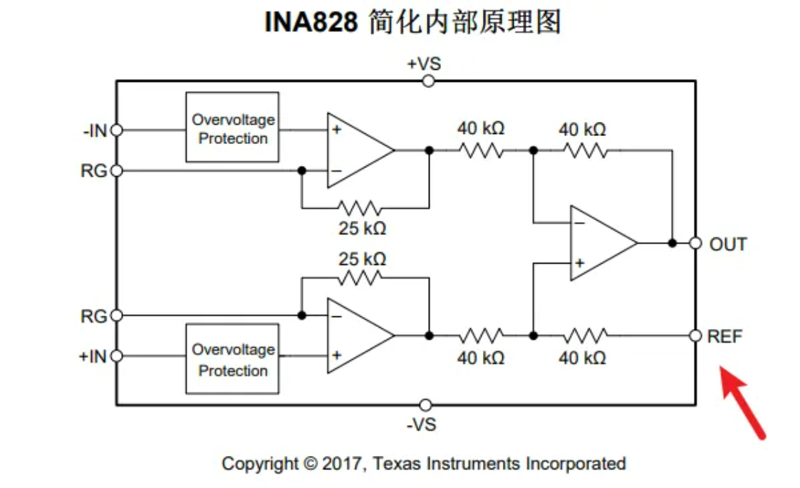 可以看到下图 是INA828的内部框图,如果使用REF3025也是可能会产生这样的问 题: