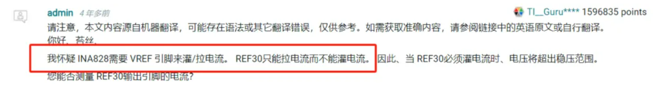 而由于REF3025不支持灌电流,所以说当输入电压VIN大于3.125V时会导致REF3025的输出不能维持为2.5V,而是被拉高了。在TI官网论坛上也看到有人遇到了相同的问题,不过那个人是使用REF3025为仪表放大器INA828提供基准源(和朋友遇到的问题根因是一样的)。
