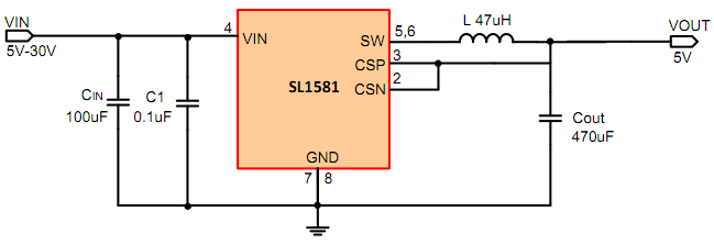 SL1581是支持高电压输入的同步降源管理芯片,在 4~30V的宽输入电压范围内可实现2.4A的连续电流输出。