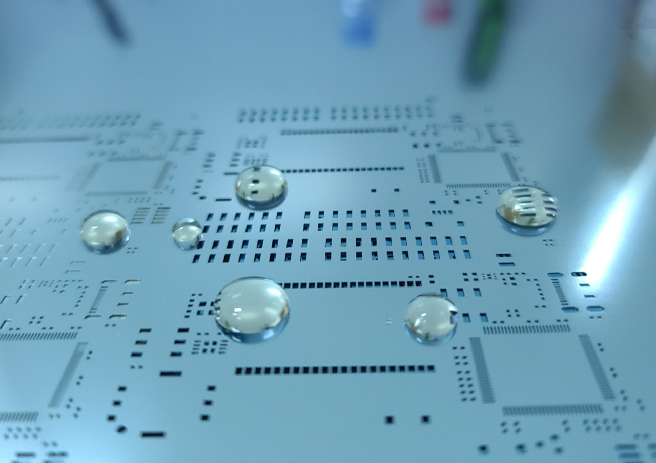 3、具有自洁能力:经纳米技术处理过的背面,形成“超疏水性表面”,使得激光钢网背面具有自洁能力,通过减少锡膏在背面的残留,减少擦拭频率,可以由原来的3-5片擦拭一次改为20-60片擦拭一次,手机等高精密类产品擦拭次数6-15片,大大降低激光钢网的擦试频率,提高产能。
