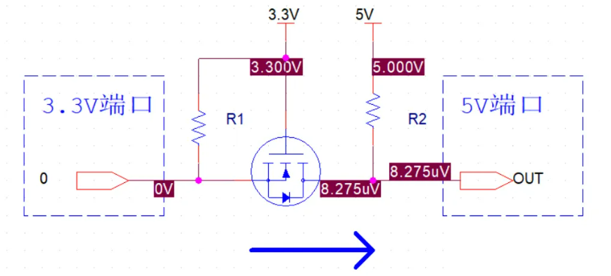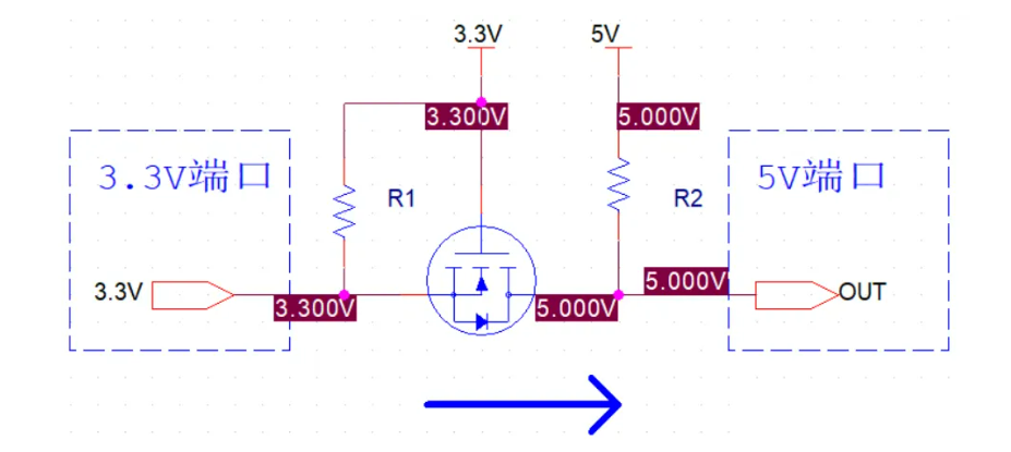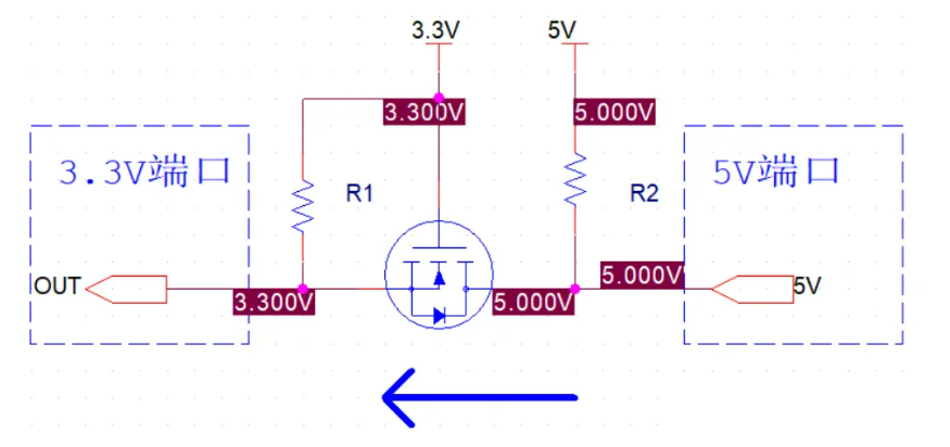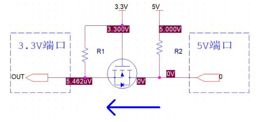 左边3.3V管脚输出为高电平时,NMOS的Vgs=0V,此时NMOS关断,5V管脚被R2上拉为高电平。