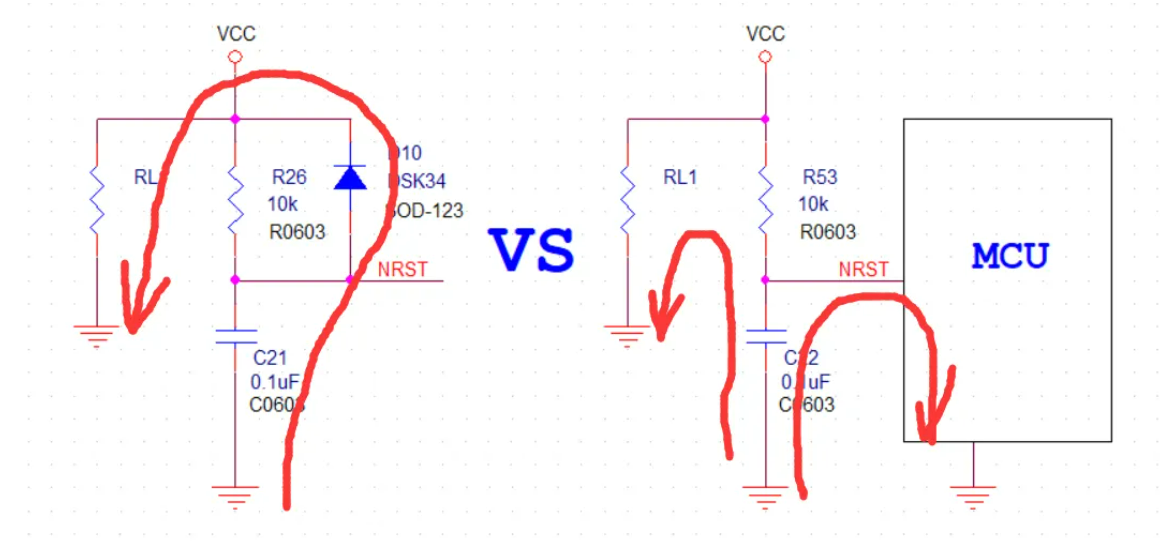 如下图所示,RL为等效负载, 二极管的存在可以让RC复位电路中的电容通过二极管快速放电,从而 保证复位电路的稳定可靠性。如果没有二极管的话,那么C放电路径就变成右图,通过R53和等效负载电阻RL 放电,以及通过单片机内部到地放电 ,速度会很慢。MCU在快速断电上电的情况下,可能会复位异常。