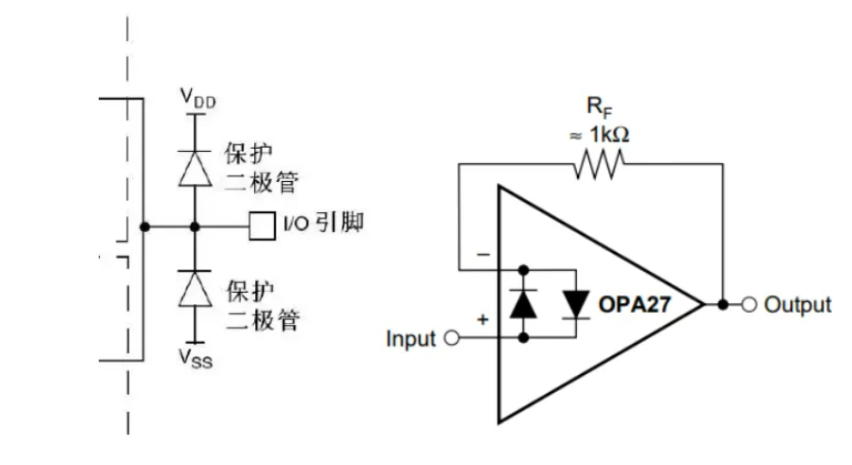 如下图,左边的保护二极管会将io的最大输入电压钳位到VDD+Vd(二极管正向导通电压),最小电压为钳位到VSS-Vd;这样如果有过压输入,可以一定程度内保护io口(对于输出io保护一样适用)。有些芯片内部(例如OP27)也会有集成保护二极管,原理也是利用了二极管的钳位功能。