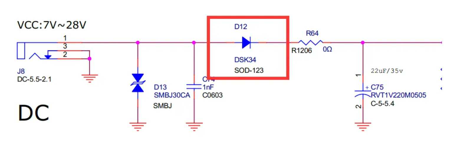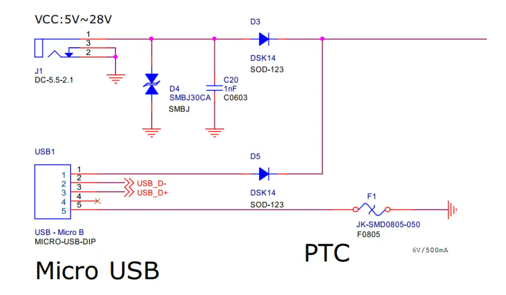 当有多个输入端口同时供电时,可以用二极管做隔离,比如下图如果DC插口(J1)和usb接口同时插入时,二极管可以防止DC插口的电(5-28V)灌入usb接口损坏usb接口。