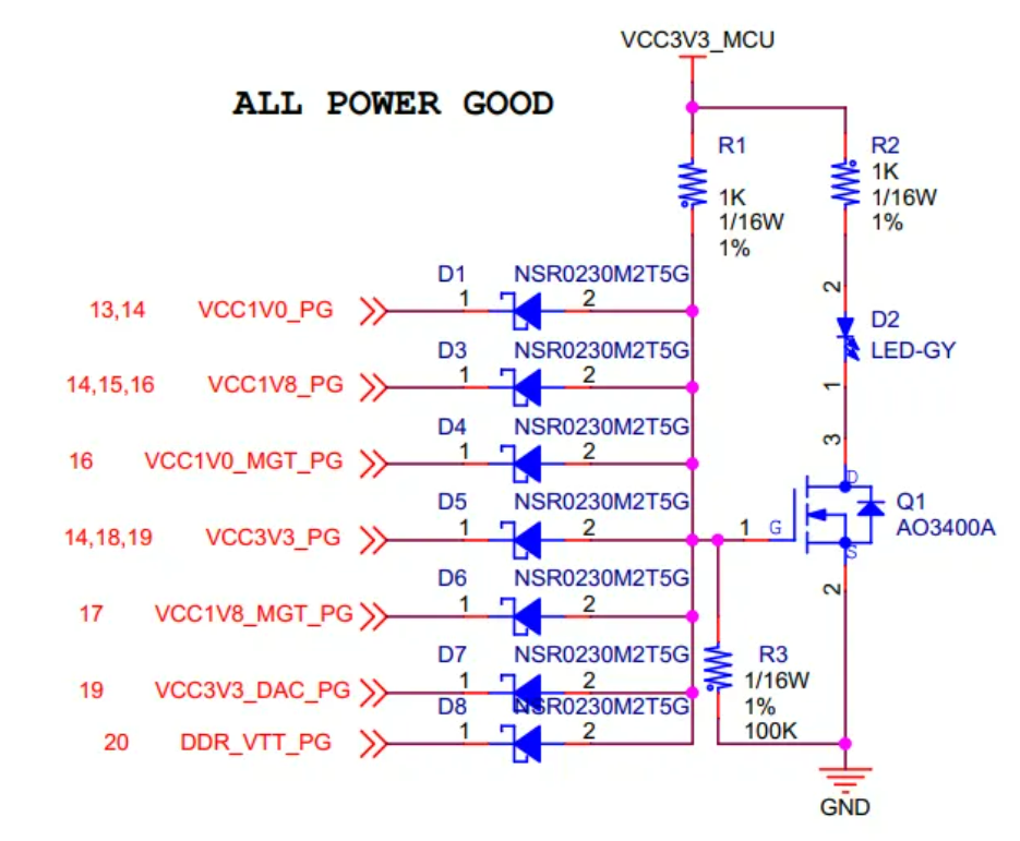 以下图为例,下图是一个二极管组成的与门,当所有的电源输出正常之后(所有的Power_good输出为高电平),此时MOS管的G极(栅极)才为高电平,MOS管导通,LED状态指示灯亮;如果有任意一个PG为低电平,则G极还会被二极管钳位到Vd(二极管导通电压),MOS管无法导通,LED状态指示灯灭。