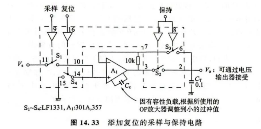 下图是把采样与保持以及复位电路通过OP放大器与IC模拟开关进行总结的一个示例。预先将S2与S3设为导通,如果S4断开,S1为导通,就取样。若将S2和S3设为断开,CT就保持之前采样的电压(此时要考虑模拟开关的漏电流)。将S2与S3设为导通,如果S4导通,就复位(运放输出跟随同相输入端输出0,给电容保持放电,复位电容)。