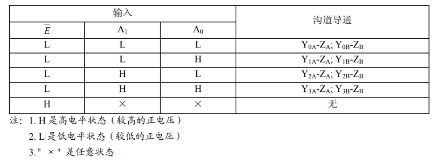 那么介绍完引脚说明,在看真值表就一目了然了,例如当使能端接到低电平时,如果A0和A1都是低电平,那么Y0A和ZA导通且Y0B和ZB导通: