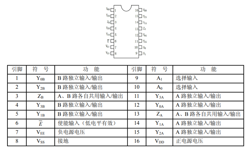 以CD4052为例介绍一下模拟开关的管脚,以及真值表(大多数模拟开关定义都差不多)。CD4052是一款带有公共使能输入控制位的2路四选一模拟开关电路。每一个多路选择开关都有四个独立的输入/输出(Y0到Y3)、一个公共的输入/输出端(Z)和选择输入端(A),那么接下来介绍一下大致的管脚定义: