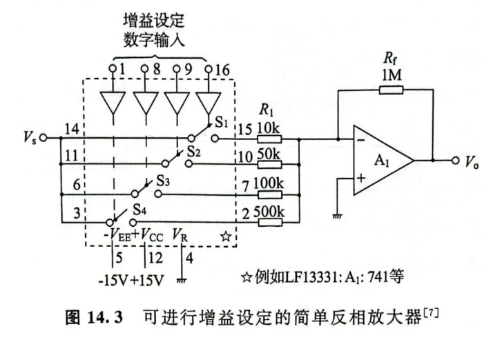 虽然也有压控增益放大器,但是它还是太贵了。那么如果例如电压表或者什么需要调整量程的时候,需要调节运算放大器增益的时候,就可以使用单片机的管脚控制模拟开关来调节运算放大器的增益。如图所示,当S1导通时,增益为1M/10k等于100倍;当S2导通时倍数就为20倍,便可以实现增益调节。