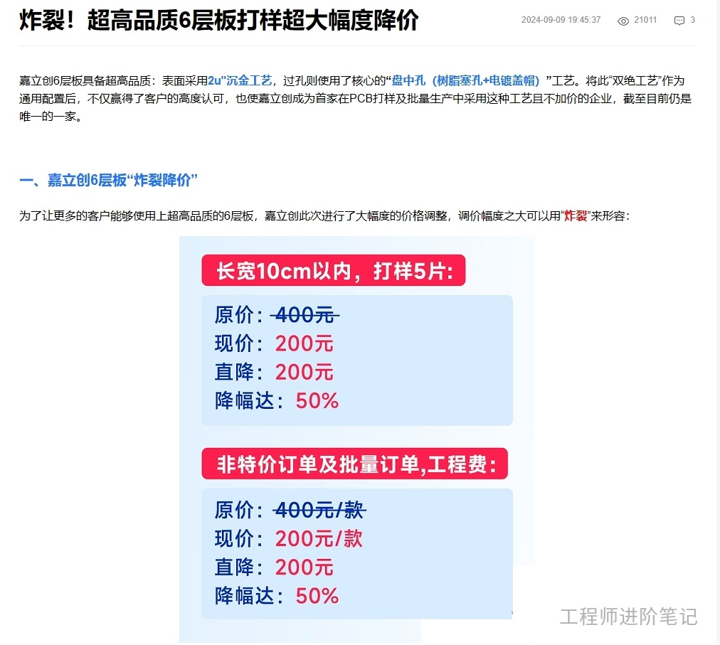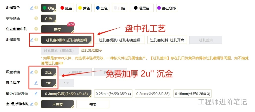 我知道嘉立创之前一直有在推广盘中孔这种工艺,所以就去他们的官网找了一下信息,好家伙,对于6层以上的高密度PCB,现在嘉立创可以免费使用盘中孔,并且还可以免费加厚至2u''沉金。