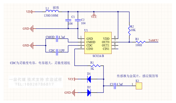 ③ CDC电容为灵敏度调整电容,电容取值范围 SC02A 为:5PF~500PF,SC02B SC01电容的取值范围为:5PF~500PF。电容越大,灵敏度越低。一般金属片感应器越大,在保证灵敏度的情况下,CDC 电容也会越大。注意:在保证灵敏度情况下,我们建议将CDC调整比较大,CDC越大,内部有效数据的信噪比会比较高,芯片看芯片干扰能力也越稳定。