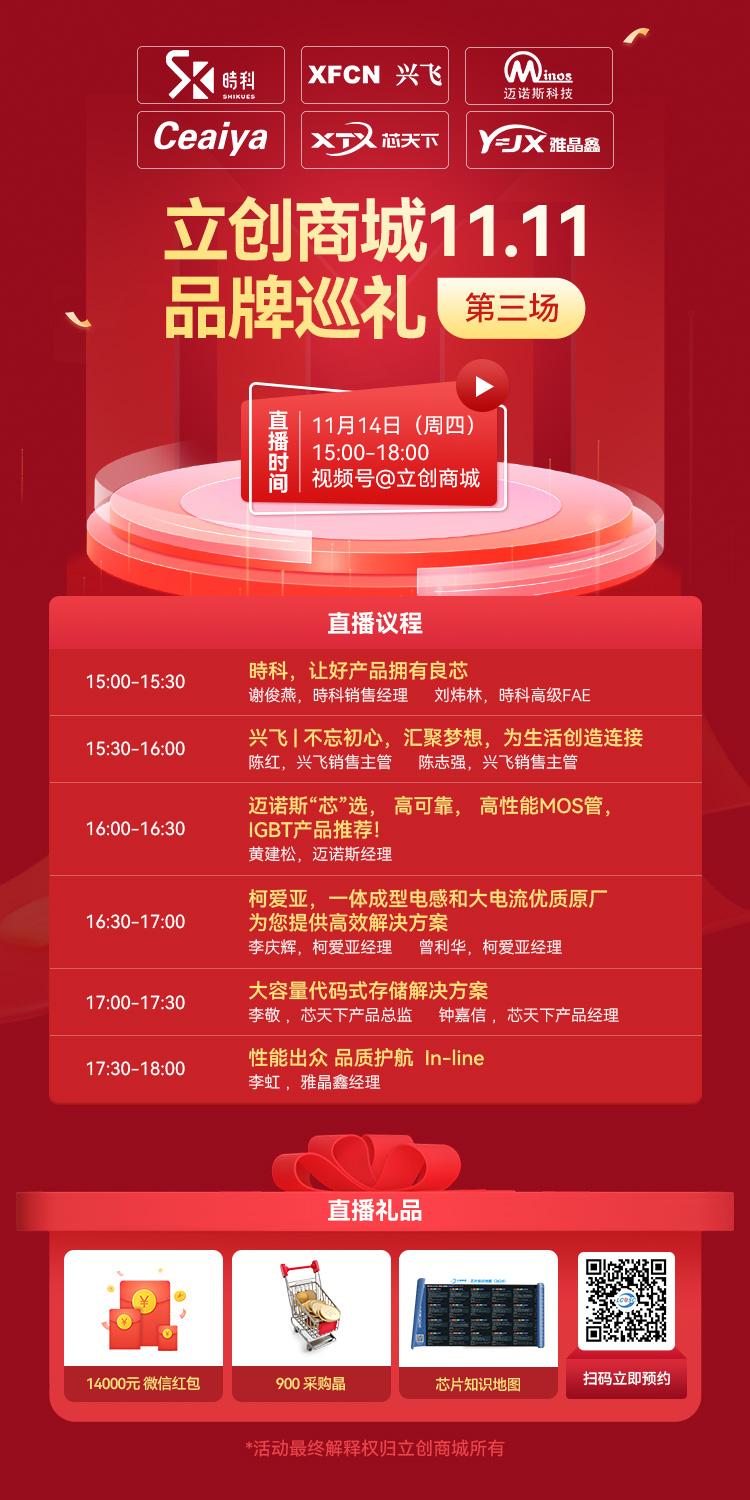 下面就来看看11月12-14日期间,立创直播间将会有哪些元器件品类和品牌的相关知识分享,如果其中有你感兴趣的请提前预约立创商城视频号直播,定好闹钟等待准时开讲吧!