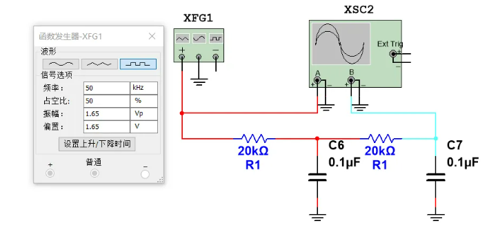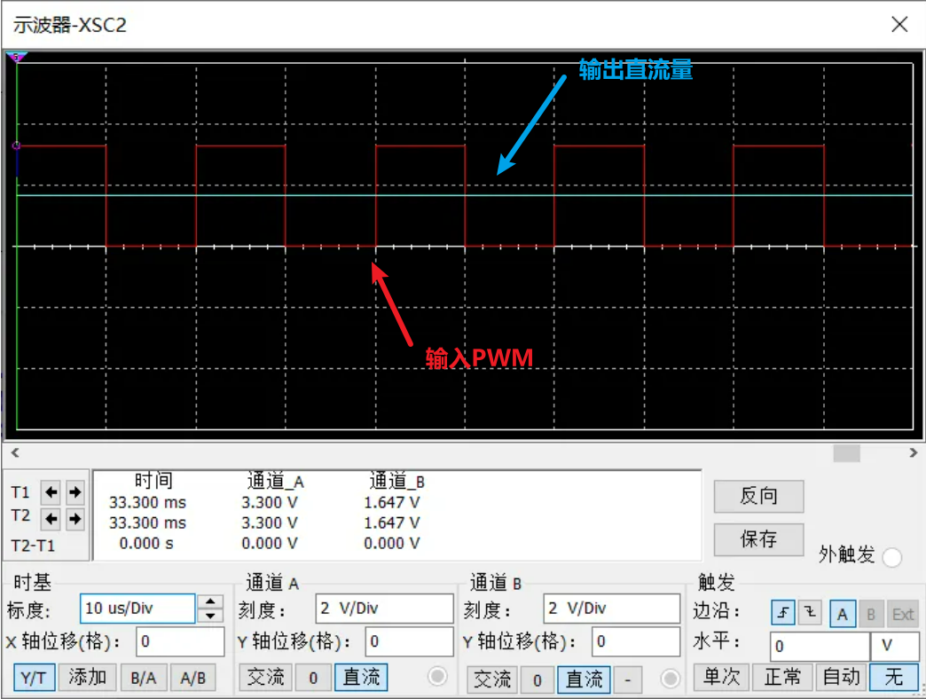 使用单片机IO口输出占空比可调的PWM,通过RC滤波器滤除其谐波分量,保留直流分量,便可实现DAC输出(根据傅里叶变化,任何波形均可分解为无数频率的正弦波的叠加)。比如幅值为3.3V占空比为50%的方波中含有1.65V的直流分量和谐波分量;如果将幅值3.3V占空比50%的方波过RC滤波后(对方波的谐波分量进行衰减),输出的电压会是1.65V,如下仿真图所示,红色为输入信号,蓝色为过了二阶RC滤波器后的取出来的直流分量。公式为: