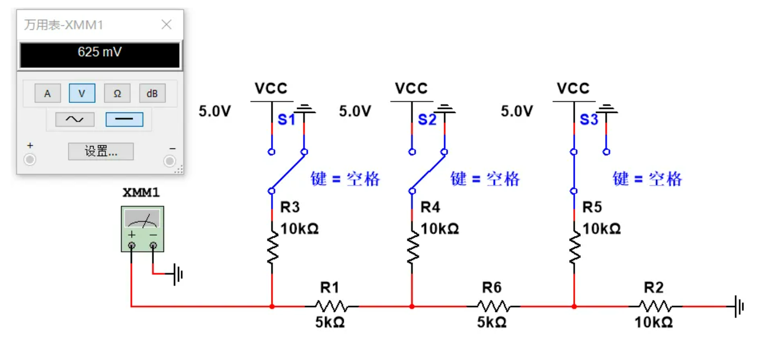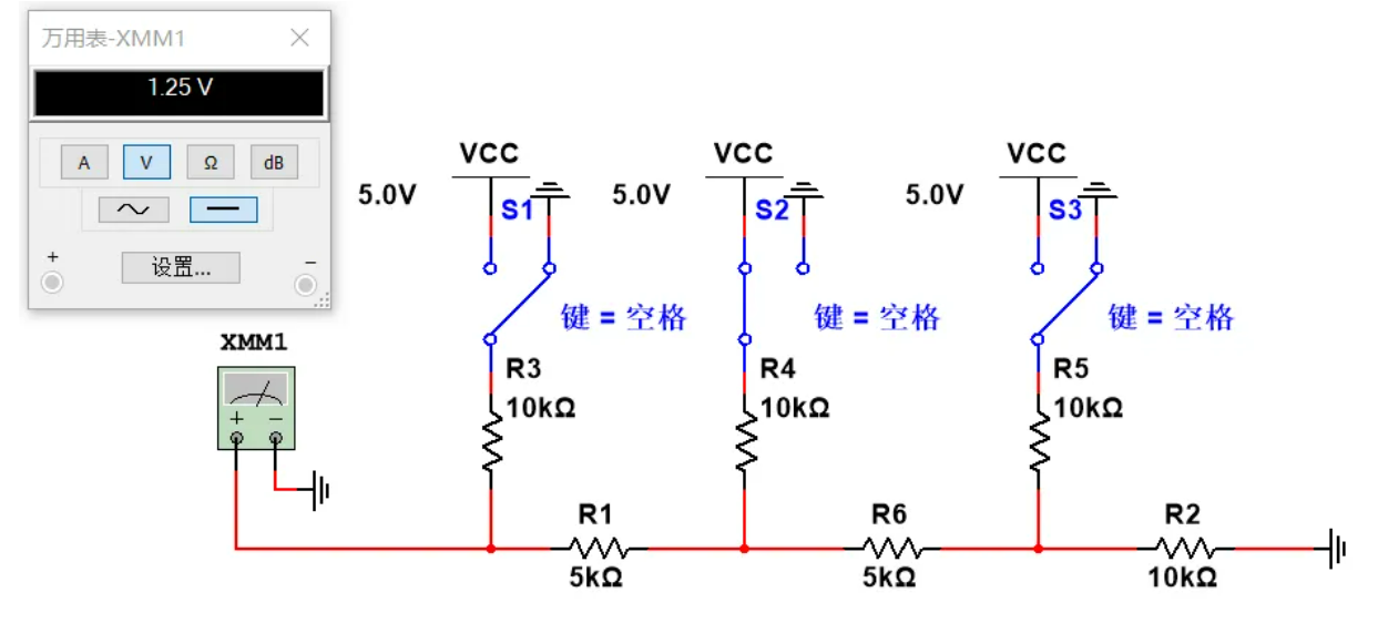 使用多个IO加上电阻组合为DAC(分辨率一般较低,N个IO可以生成2bit位的DAC),比如用三个IO和电阻可以组合为一个8bit的DAC。如下图所示,使用开关代替IO输出高电平或者低电平,S3接到VCC(三个开关分别为0 0 1),则输出电压为VCC/8,S2接到VCC(三个开关分别为0 1 0),则输出电压为VCC/4,以此类推,最大输出电压为7*VCC/8(三个开关分别为1 1 1时);若拓展分辨率可按照R/2R型类推。