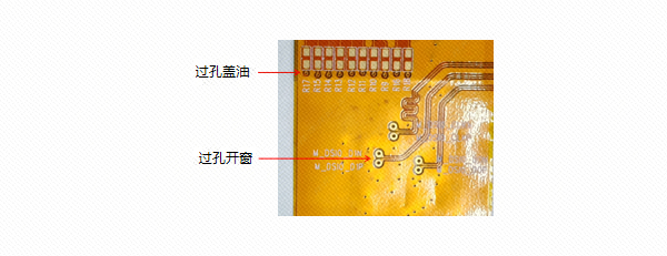 过孔不能一半开窗,一半盖膜,需要保留0.5mm以上的安全间距