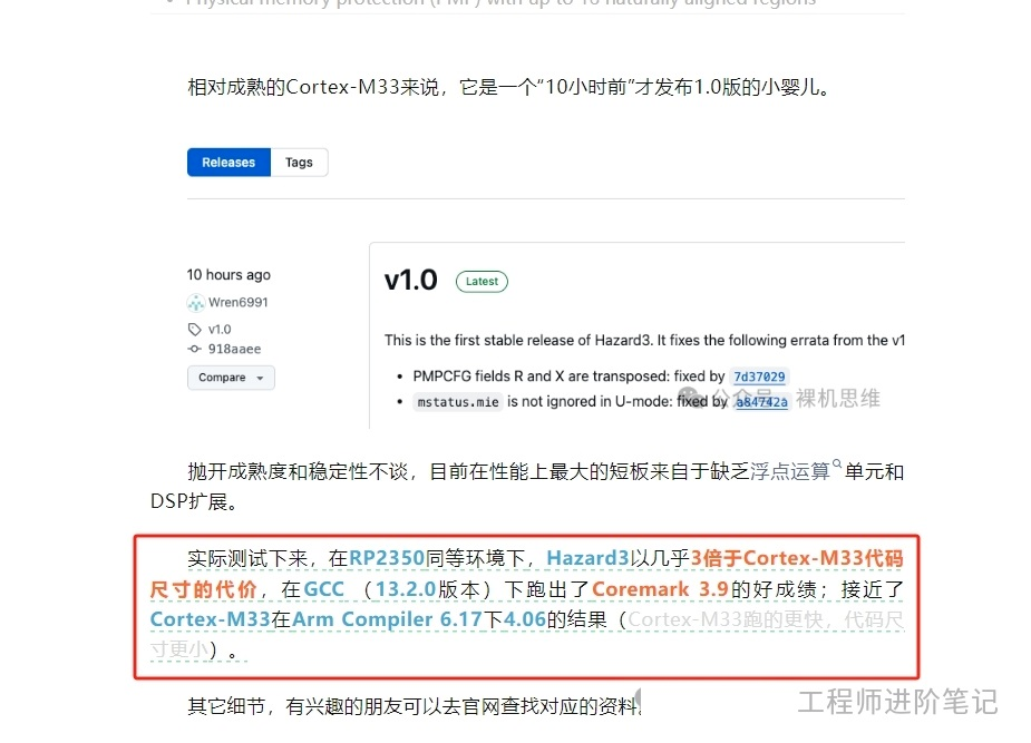 根据傻孩子大佬(公众号:裸机思维)的测试,RISC-V核心 Harzard3 在较大代码尺寸的情况下跑出了 Coremark 3.9 的成绩,而 Cortex-M33 跑出同样成绩的代码尺寸更小。(估计是 RISC-V 核心 Harzard3 刚出生不久的原因?)