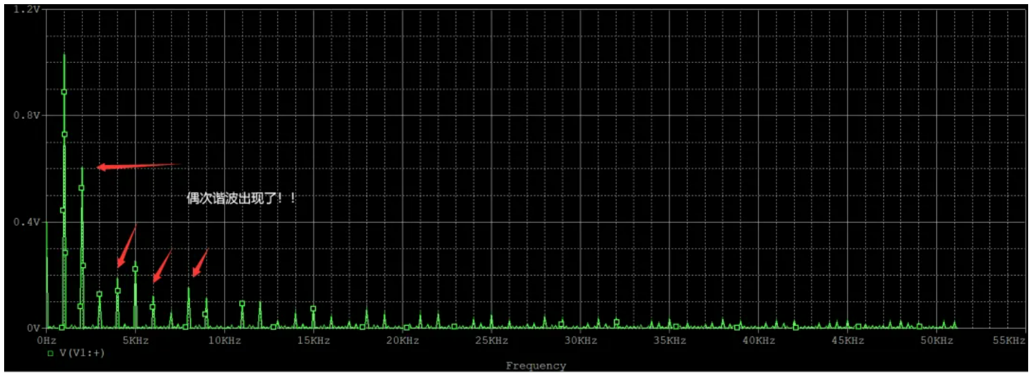 对其进行傅里叶变换,转化到频域,波形如下,偶次谐波出现了!!