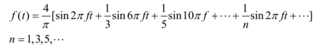 方波可以分解为频率为 f 赫兹(f=1/T)幅值为 4/pi的正弦波,加上频率为 3*f 幅值为4/(3*pi)的正弦波,再加上频率为5*f幅值为4/(5*pi)的正弦波,以此类推无数正弦波的叠加。
