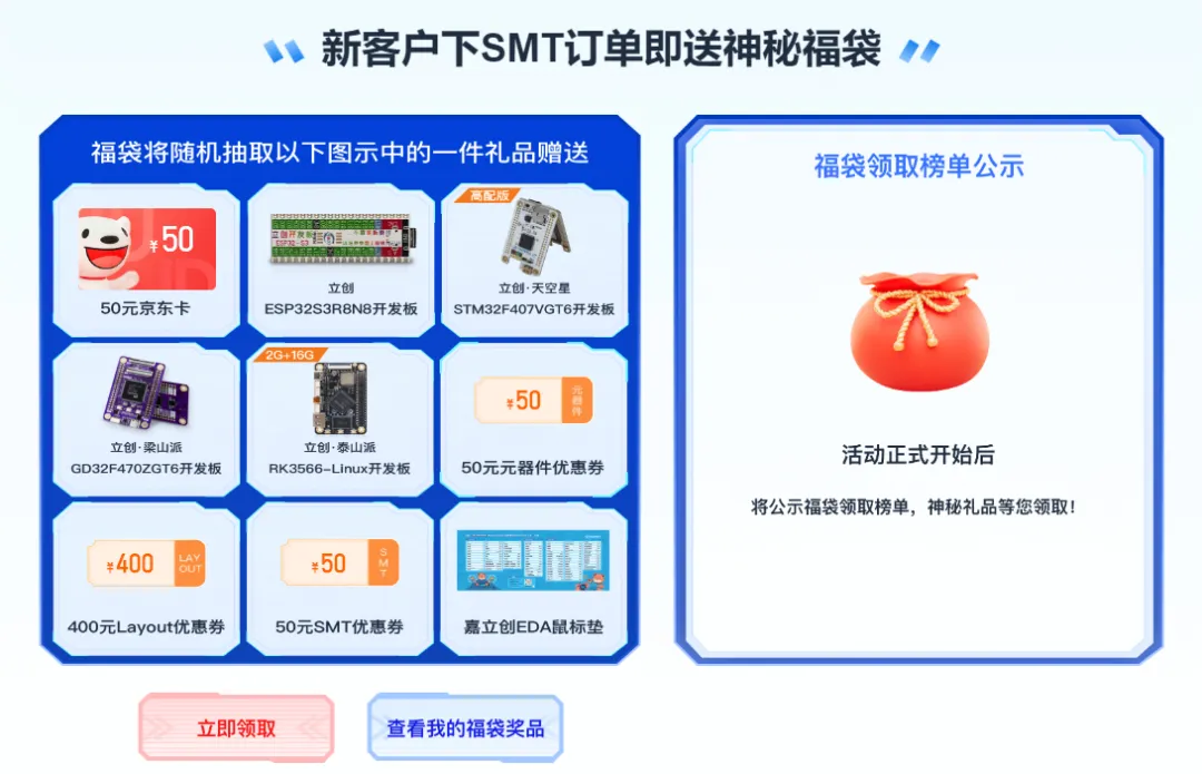 正式活动期间,若嘉立创SMT新客户存在提交且支付成功的SMT订单,都将获得一个抽取神秘福袋礼品的机会。