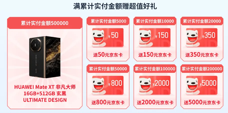 老客户优惠一:满额赠京东卡,最高送华为三折叠手机