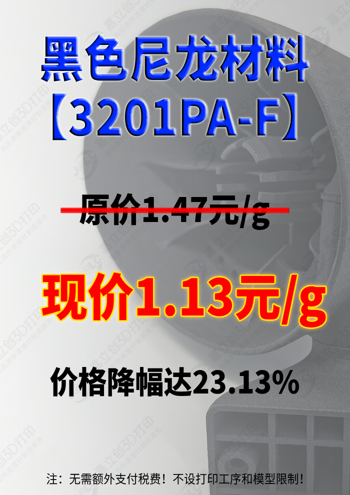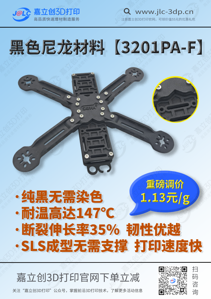 高性能黑色尼龙【3201PA-F】重磅调价至1.13元/克,该材料表面颜色均匀,无需二次染色,耐温性高达147℃,远超树脂的40-80℃,适合制造耐热部件。同时具备35%的断裂伸长率,韧性出色,能有效抵抗外力导致的断裂。其采用SLS选择性激光烧结成型技术,无需传统支撑结构,打印速度快且性能优异,适用于汽车制造、航空航天、消费品和医疗机械等领域,例如可以制造无人机结构件、汽车装配件、电子外壳、产品结构件等高质量产品。最快可在72小时内发货,交期灵活可调。注册嘉立创3D打印官网可领55元优惠礼包,下单立享优惠!
