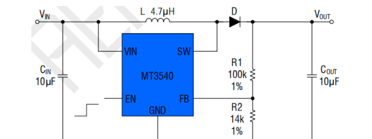 MT3540使用固定频率、峰值电流模式的升压调节器架构来调节反馈引脚处的电压。MT3540的操作可以通过参考图2的方框图来理解。在每个振荡器周期开始时,MOSFET通过控制电路被打开。为了防止占空比大于50%的次谐波振荡,在电流感测放大器的输出中增加一个稳定斜坡,结果被输入PWM比较器的负输入。当该电压等于误差放大器的输出电压时,功率MOSFET被关闭。误差放大器输出处的电压是带隙参考电压与反馈电压之差的放大版本。这样,峰值电流水平就能保持输出在调节状态中。如果反馈电压开始下降,误差放大器的输出就会增加。这导致了更多的电流通过功率MOSFET,从而增加了传递到输出的功率。MT3540具有内部软启动功能,以限制启动时的输入电流量,并限制输出上的超调量。