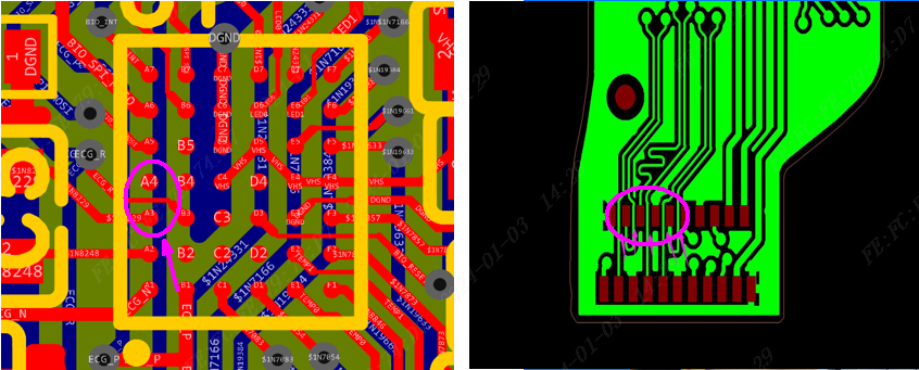 6、下图所示,排线线路稀疏,拐角处容易撕裂,建议在板边增加防撕裂铜条或在背面增加网络铜。