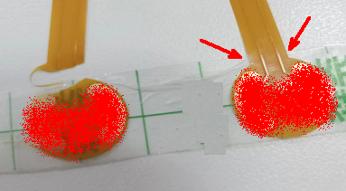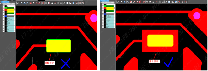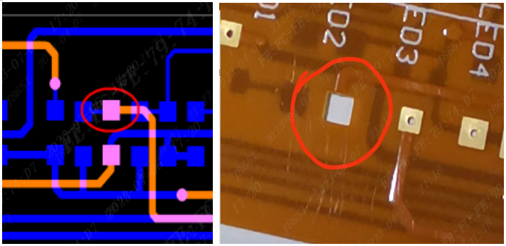 2、尽量不要设计独立焊盘:下图所示,线路焊盘是独立的,且两面重叠,因FPC中间基材仅25um,焊盘容易脱落,建议增加覆铜 ,并在焊盘四角增加连接线,与覆铜相连,且上下两面焊盘需要错开,增加结合力。