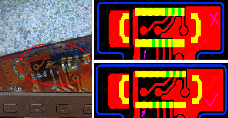 1、大铜面氧化:因设计的是大铜面,压覆膜时空气很难排掉,空气中的湿气与铜面在高温高压下产生氧化反应,导致外观不良,但不影响功能,为避免名这种问题,建议设计成网格铜皮,或在大铜面上增加阻焊开窗。