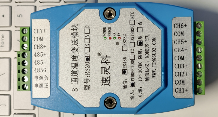 2:8 路热电阻传感(PT100/PT1000)器输入,两线制。