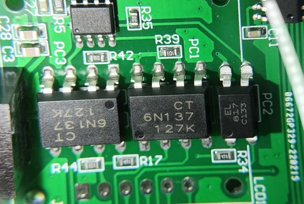 看了一下这块模块支持的485通信速率为300~115200,可能这也是RX和TX用了两颗高速光耦的原因,由于485的使能不需要很快速的翻转,所以使能用了一个普通的817做隔离: