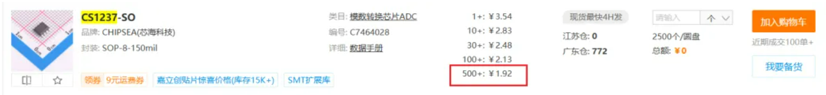 另外也有朋友推荐芯海的CS1237,是一个单通道的24bit的ADC芯片,大概批量1.9左右,我也就顺带着记录一下,也方便回头我自己查找: