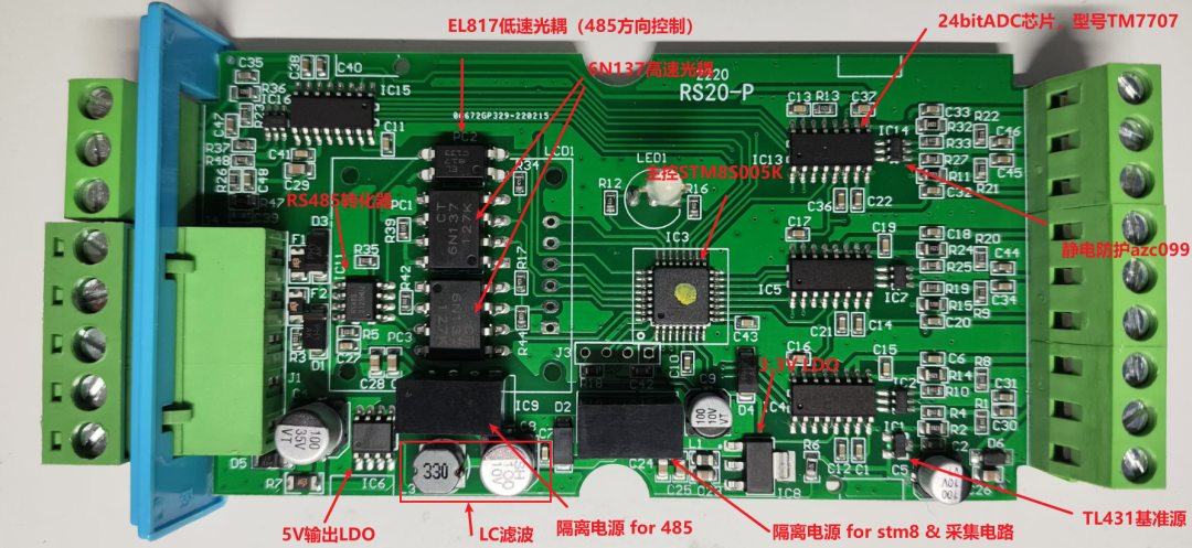 比较有意思的是,ADC采集芯片的丝印被打磨掉了,总共用了4颗ADC芯片,每一颗差分采集两颗RTD电阻的电压。虽然这个ADC芯片的丝印被打磨掉了,但是根据这个芯片的外围电路连接,还是猜出来了这个芯片就是TM7707,是一颗24bit分辨率的ADC芯片。同时RTD的接口使用了azc099作为静电防护。