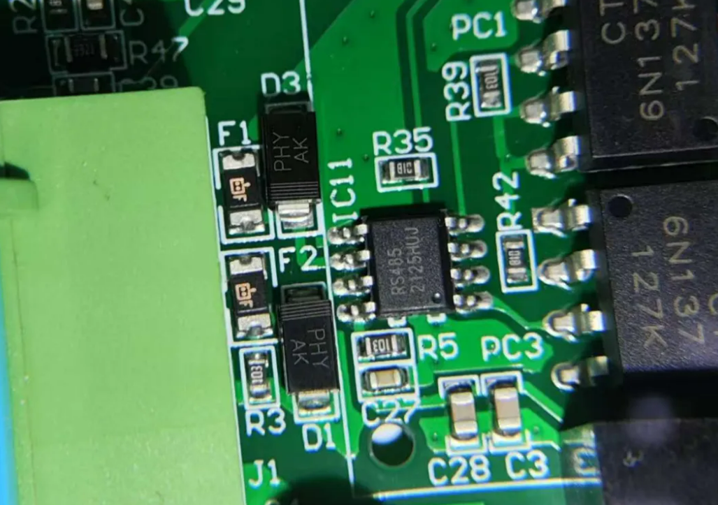 RS485的AB通讯接口 采用的是 SMAJ6.5A,一个单向的 6.8V的 瞬态抑制二极管 共模防护,并没有差模防护,防护做的一般。