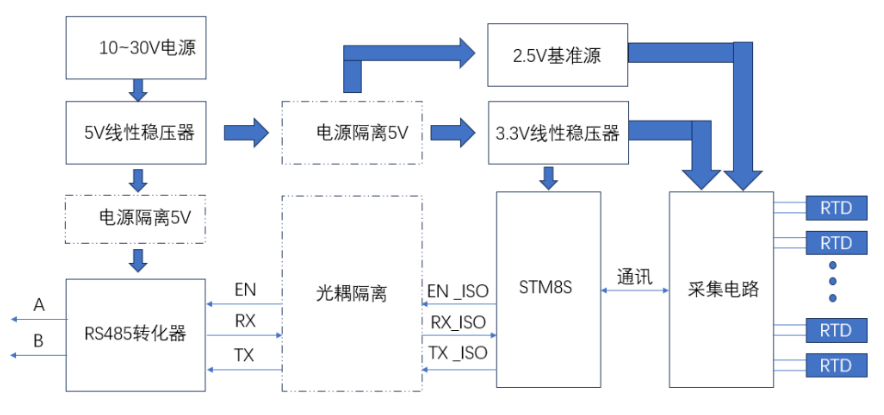 拆开后可以看到电路由3个部分组成,分别是电源部分,采集部分,以及通讯部分。电路整体的框图大致如下: