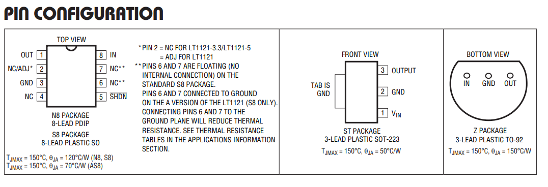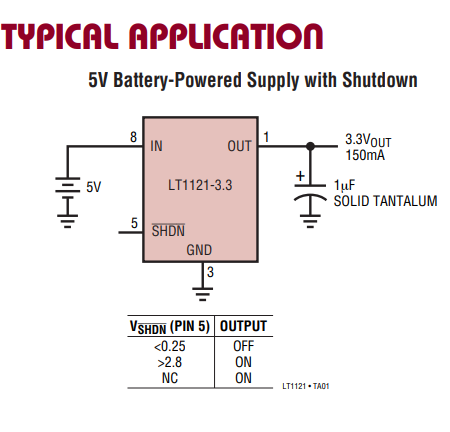 LT1121/LT1121-3.3/LT1121-5是具有关断功能的微功率低压差稳压器。这些设备能够以0.4V的压降提供150mA的输出电流。这些设备设计用于电池供电系统,低静态电流(30µA运行,16µA关断)使其成为理想的选择。静态电流得到良好控制,不会像许多其他低压差PNP稳压器那样在压降时上升。