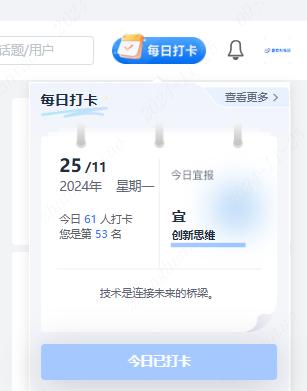 登录社区,点击页面右上角的【每日打卡】图标进行打卡,还可点击每日打卡浮层中的【查看更多】进入打卡详情页,发布您的打
