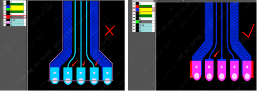 2、焊接手指板内焊盘上的过孔不能加成一排,防止应力集中在过孔上,容易导致断裂。