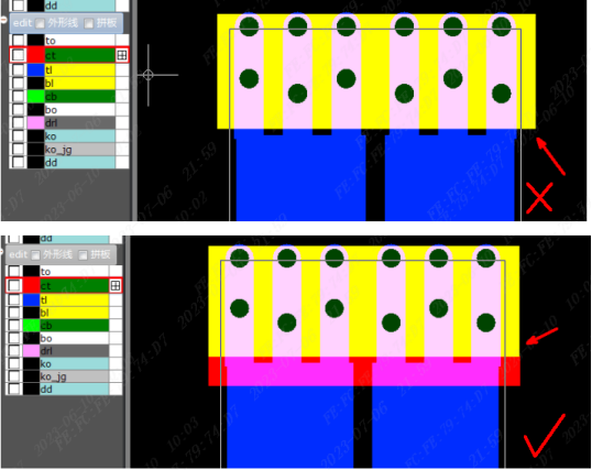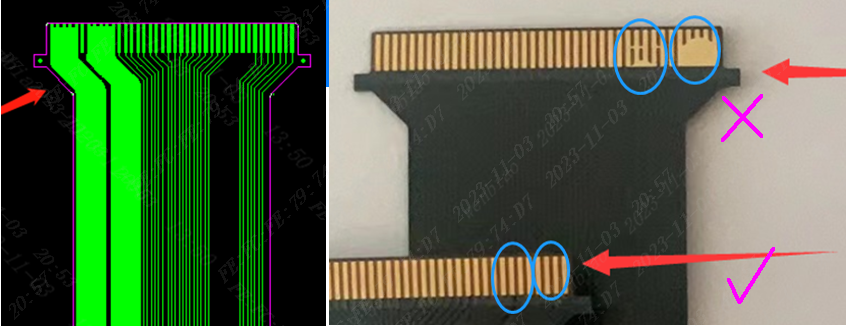 3、焊接金手指上下覆盖膜要错开0.3mm以上,防止折断。