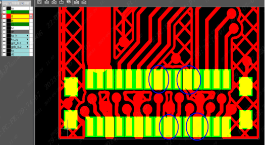 7、因FPC是使用的阻焊膜不能像绿油一样做阻焊桥,在设计IC类焊盘时,焊盘上不能有多余的覆铜(如下图圈住的焊盘设计不合理),否则会导致焊盘变大,间距变小,焊接时容易短路。