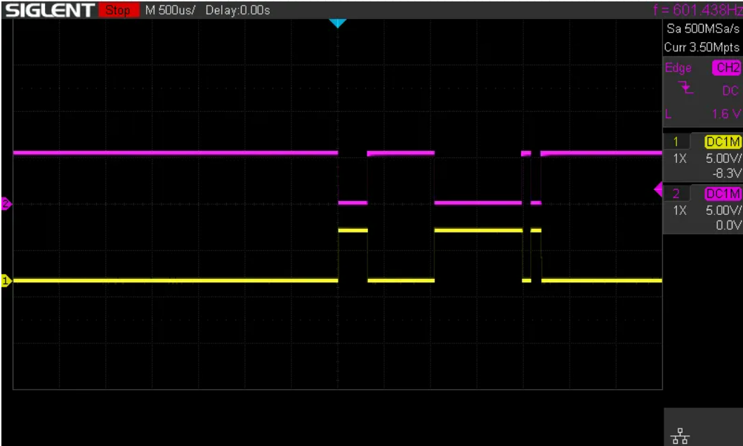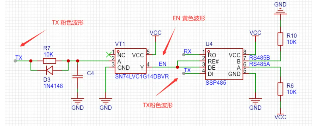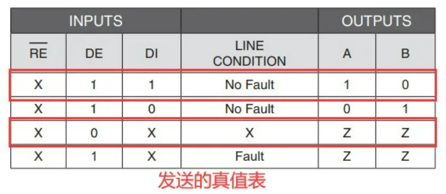 当TX为低电平时,经过反相器后DE变为高电平然后使能芯片发送A 0 B 1;