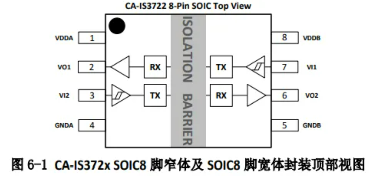 数字隔离IC型号为IS3722 HS , 空闲时间输出高电平 ,每条隔离通道的逻辑输入和输出缓冲器均由二氧化硅(SiO2) 绝缘栅隔离,额定耐压3.75kV。